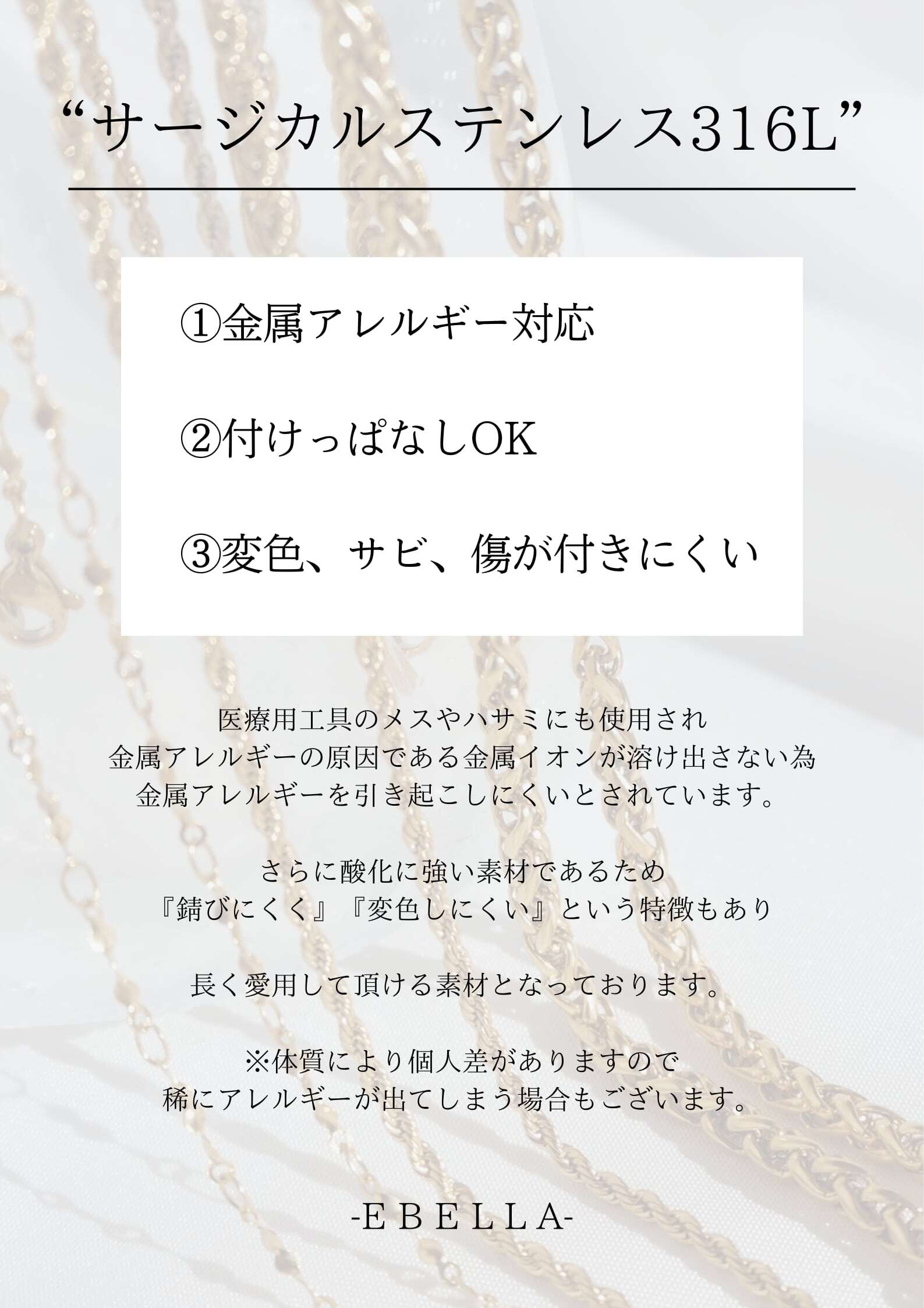 医療用品にも使われる安心素材【サージカルステンレス316L】水や汗に強く、錆びにくい、アレルギーの方でも使いやすい素材となっております。